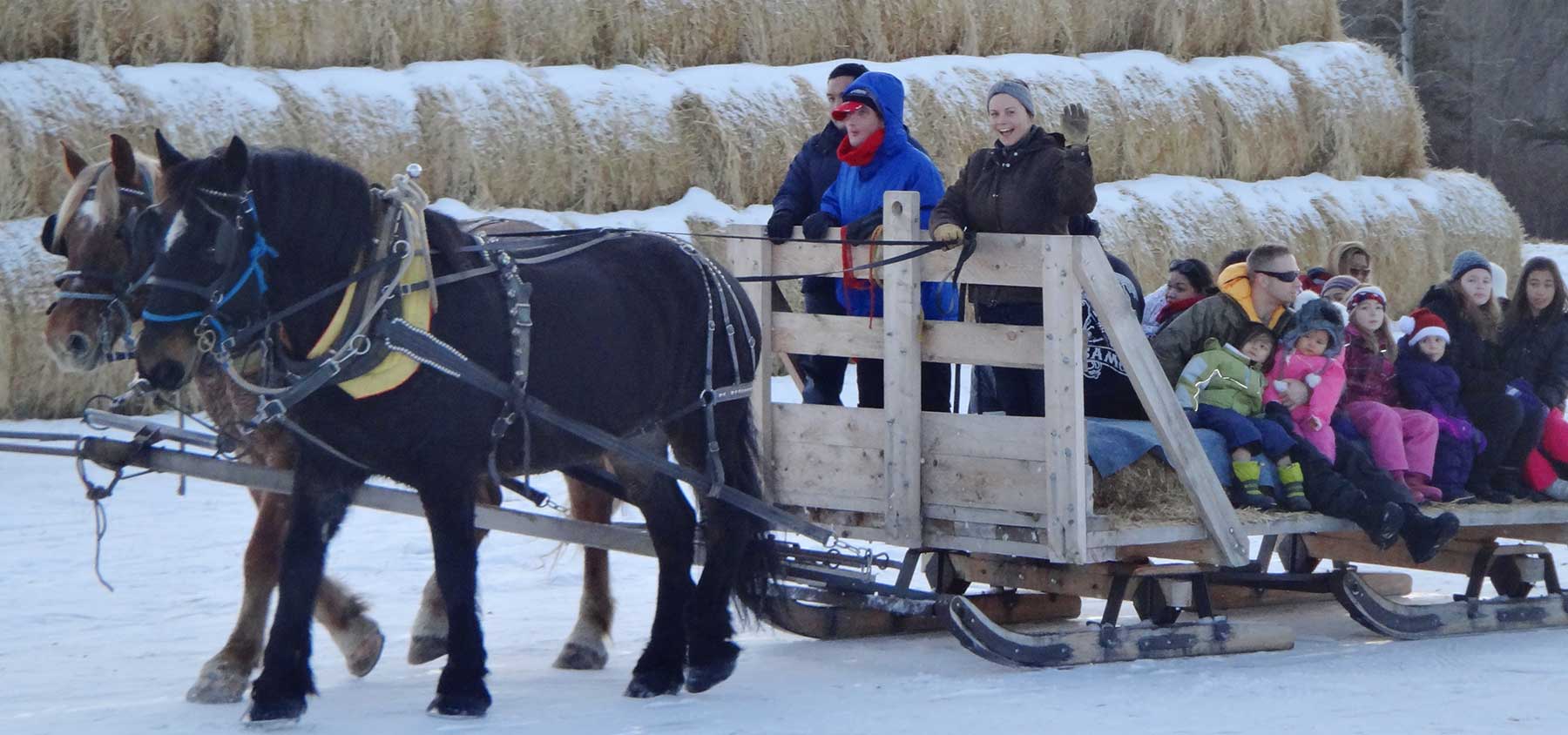 We have sleigh rides available all winter long, if there isn’t enough snow  we use wagons. Our teams of Belgians and Percherons will pull up to 12 adults on a wagon or sleigh for an hour of exhilarating fun. If there’s enough snow, we also have an Olympic calibre toboggan hill for your pleasure.